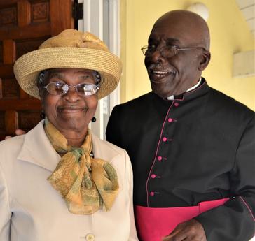 Monsignor Johnson greets people before Mass and stands with Mrs Esther Rolle who remembers the monsignor as a young boy in Bimini.